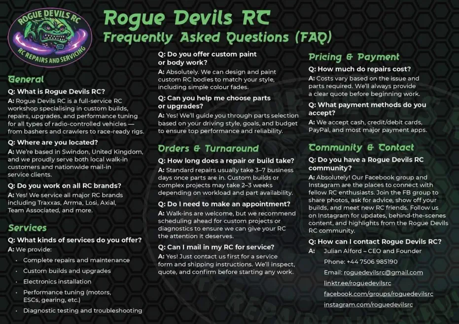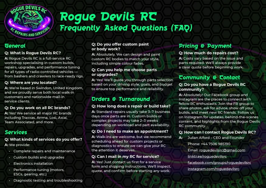 At Rogue Devils RC, we combine technical expertise with a true love for all things RC. Fast turnaround, honest work, and results that speak for